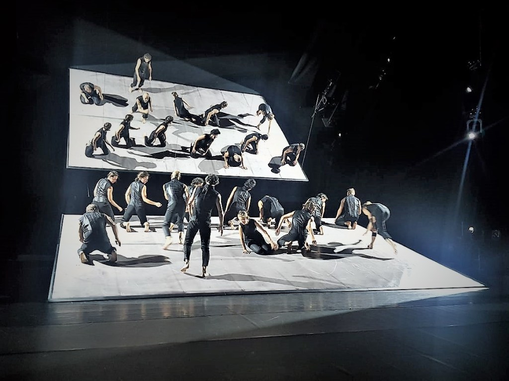 Le spectateur est en apnée dans cet équilibre des lumières et devant cette technicité d’une scène mécanisée à la force du poignet du régisseur. Un plateau d’apparence minimale, qui en réalité a exigé un investissement de titan à la scénographe Neda Loncarevic pour servir le propos de la chorégraphe et propulser des jeux de lumière sur le miroir afin de sublimer les tableaux de « Lumen ». De tableaux, il ne faudrait d’ailleurs par parler, tant la fluidité d’enchaînements des lignes géométriques et chorégraphiques des treize artistes est remarquable. On notera des groupes de deux individus aux costumes uniformisés avec ces tuniques sans manches très sombres mais révélant des motifs de haute-couture au gré des projections de lumières. Des pièces complexes aux coutures ciselées conçues par un costumier inspiré nommé Toni Teixeira. Il n’y a pas ou quasiment pas de défaut dans l’exécution des formes. Le ballet des gestes millimétrés fait penser à une répétition de voltigeurs en parachute, à même le sol, avant de prendre l’avion. L’essentiel du début de la création se joue sur ce plateau mouvant, à même le sol… avant de prendre de la hauteur.