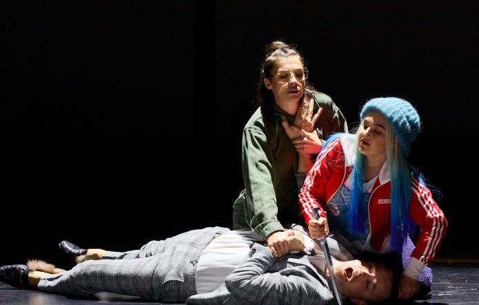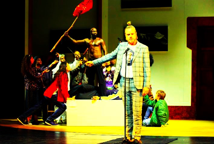 Rau intègre des acteurs non professionnels issus essentiellement de la migration, ajoutant une dimension documentaire à la représentation. Des témoignages vidéo évoquent les parcours d’exil et de souffrance, rappelant les tragédies contemporaines sans sombrer dans le pathos. Le parallèle avec la Révolution française est frappant : pourquoi, après une révolution contre les élites, un opéra célèbre-t-il la clémence d’un souverain ? Le tableau de Delacroix La Liberté guidant le peuple est incarné par les comédiens. Rau interroge cette récupération des valeurs révolutionnaires par une élite cherchant à survivre, à se recomposer, à s’auto-critiquer. Sans doute. Cette critique est également propre à la société du spectacle, dénoncée par Pierre Bourdieu. Une société marchande, incarnée ici par un comédien devenu enseignant, ancien marchand d’art, qui avoue son absence de sens moral face à l’argent. Milo Rau dépeint un monde nourri de contradictions, tout en aspirant à une utopie de justice et d’équité, même si elle semble inaccessible. Le décor avant-gardiste, froid, accentue cette distance entre les sphères privilégiées et la réalité des opprimés.