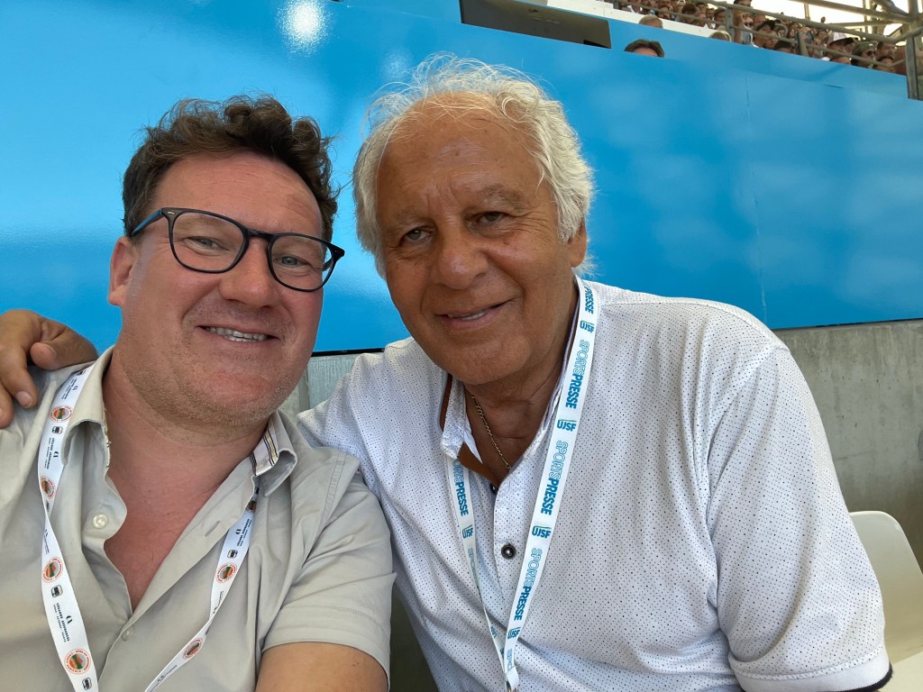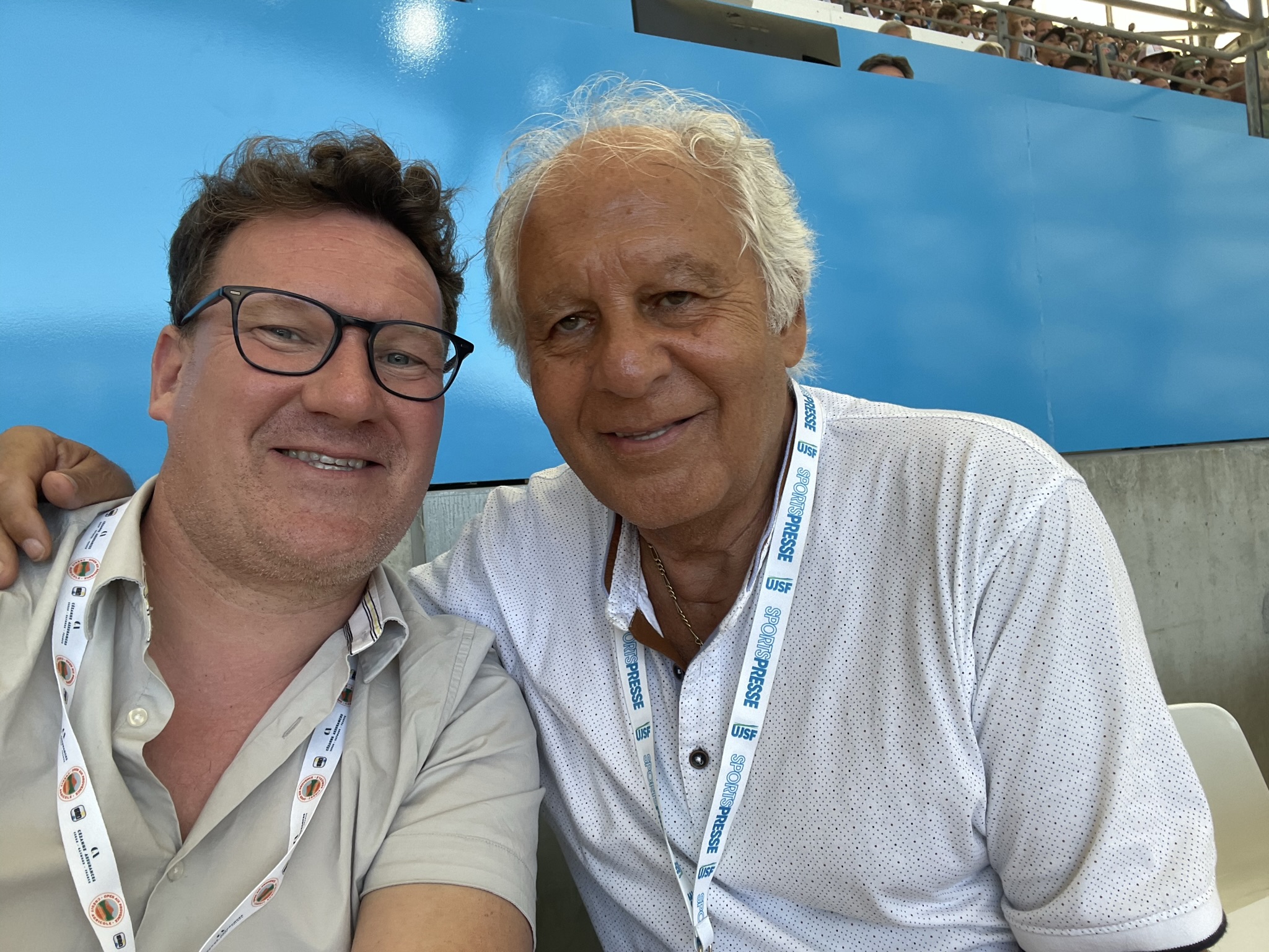 Avi est là et notre rencontre se passe bizarrement. Je pousse un biscuit abandonné sur une table et m’installe à cette même table, sans savoir qu’il s’agit de sa place. Il arrive peu jouasse, je m’excuse et me présente, il donne son nom et je m’exclame, “le célèbre Avi de France Bleu Provence!” Commence une discussion d’histoire sur le sport, la radio et surtout l’Olympique de Marseille. C’est animé, un peu décousu, l’homme a tellement d’anecdotes à raconter qu’il faudrait des années pour les consigner. Il suit le match pour ses followers sur son compte Facebook, intervient encore souvent comme consultant dans les médias et se bat pour ce match de rentrée avec un moniteur offrant les images de la captation aux différents reporters présents. Sauf que cet écran a plusieurs fois décidé de faire grève… On s’en plaint puis finalement on s’en amuse. L’interet est ailleurs, sur le turf du Vélodrome. Le stade vrombit, Marseille est magique. Paris, c’est loin, Le Mans (mon vieux stade Leon Bollée à l’époque du Multiplex, aujourd’hui détruit), aussi.