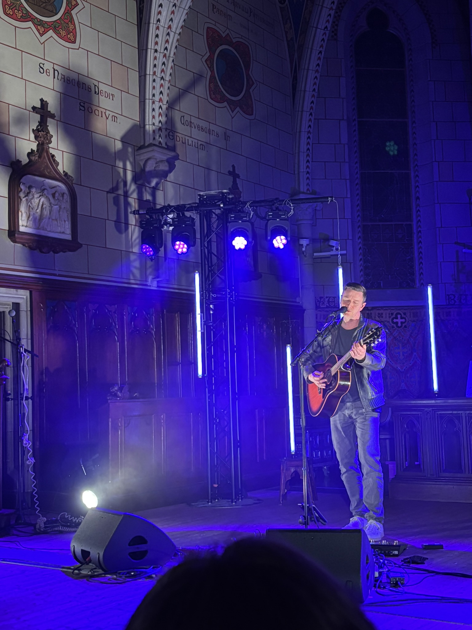 Why? Too many effects in a microphone that amplifies his voice excessively, that’s why. Too much sound in the amps, too much in the general amplification, too much in the return amps. We are in a church, and while some of Joseph Arthur’s songs are delicate, the overwhelming amplification of the concert proves really unfortunate.