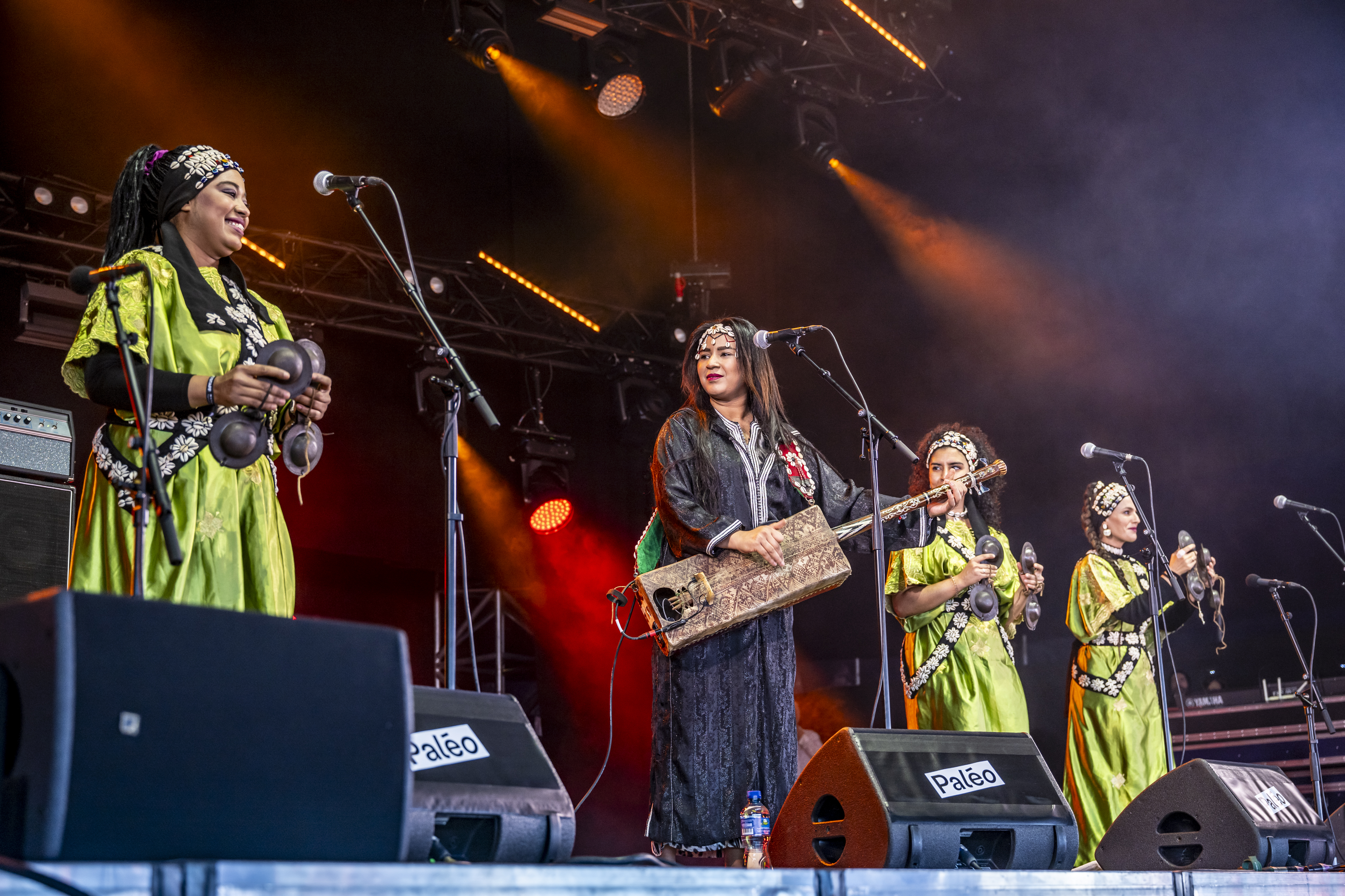 Plus tard, au Dôme, Asma Hamzaoui et son groupe Bnat Timbuktu ensorcellent. Les choristes renforcent le récit de la chanteuse gnawa, et tout ce petit monde installe un groove redoutable. Leur gnawa à elles, c’est une matière en mouvement, patiemment sculptée, hypnotique. Le guembri en bandoulière – image rare chez une femme – Asma fait monter la tension jusqu’à une douce transe. Les chants se propagent dans les premiers rangs, portés par les réponses vibrantes des dames de Tombouctou. Les drapeaux palestiniens flottent, discrets mais puissants, dans ce Village du Monde aux couleurs du Maghreb, qui prend des allures de tribune pour ce qui sera une journée en faveur d’un peuple gazaoui en détresse. Paléo devient une tribune politique. Et si cela faisait avancer plus vite les choses ?