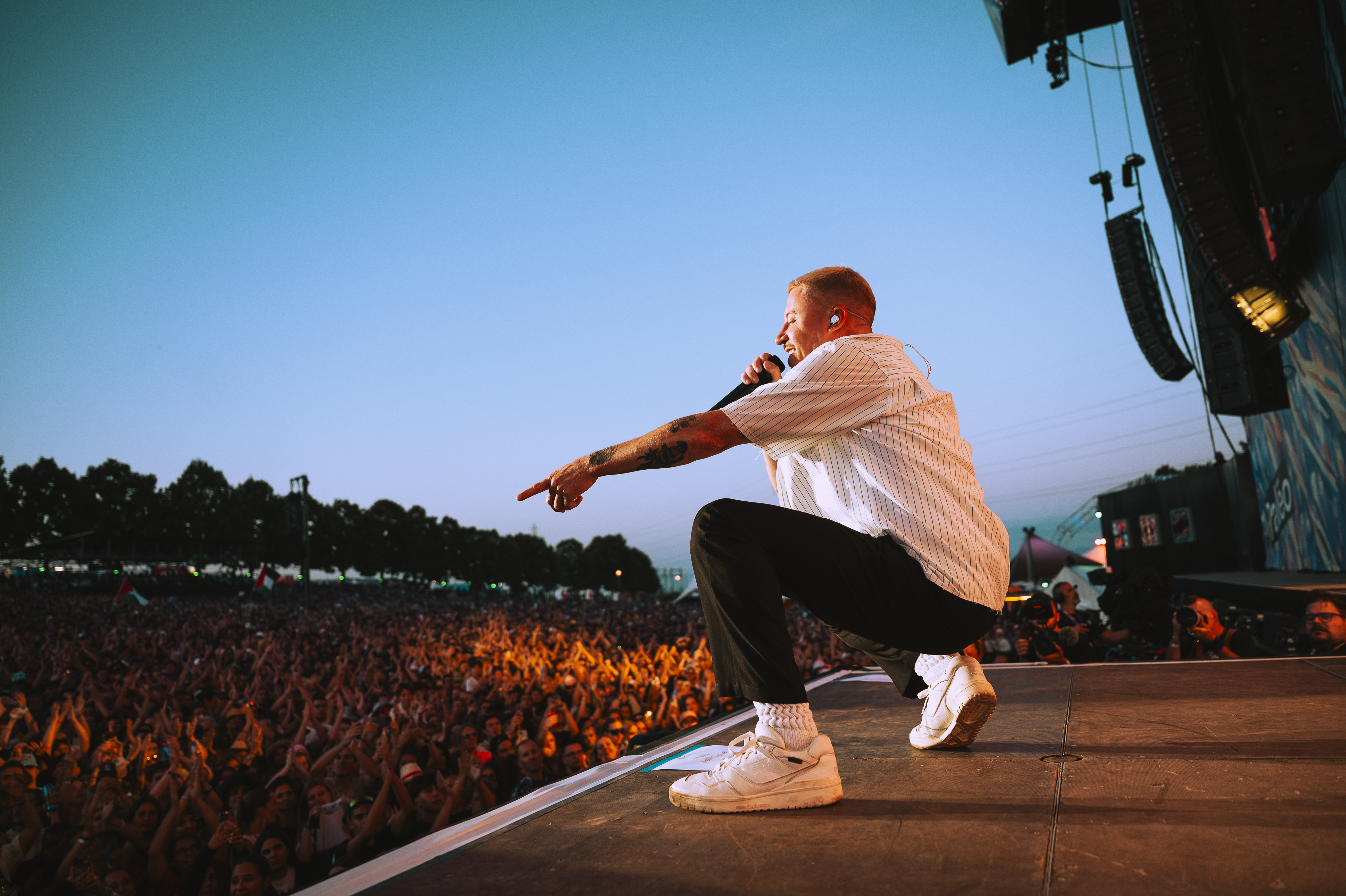 Sur la grande scène, Macklemore fait monter quatre danseuses et danseurs nyonnais. Lui aussi évoque la Palestine, sans diplomatie, sans détour : Pas d’occupation. Pas de colonisation. Pas de famine imposée. Pas de massacre sans fin. Le message est clair. Macklemore aime lui aussi son bain de foule, et il traverse les corps pour porter ses mots très haut, très loin. Le natif de Washington State est un showman, accompagné de choristes top-notch, de danseurs, d’un batteur au look de joueur de foot US. L’ensemble est huilé, performant, mais touchant, sincère, sans le cynisme parfois mercantile d’un Sean Paul vu dans un déluge de lumières et de sons ultra cut, préférant le megamix des hits aux interprétations pénétrées pendant 3 minutes 30, montre en main. On joue les tubes aussi chez Ben Haggerty, oui, mais surtout avec le cœur, la générosité, l’envie de faire résonner sa voix colorée, son flow sucré et mitraillette à la fois.