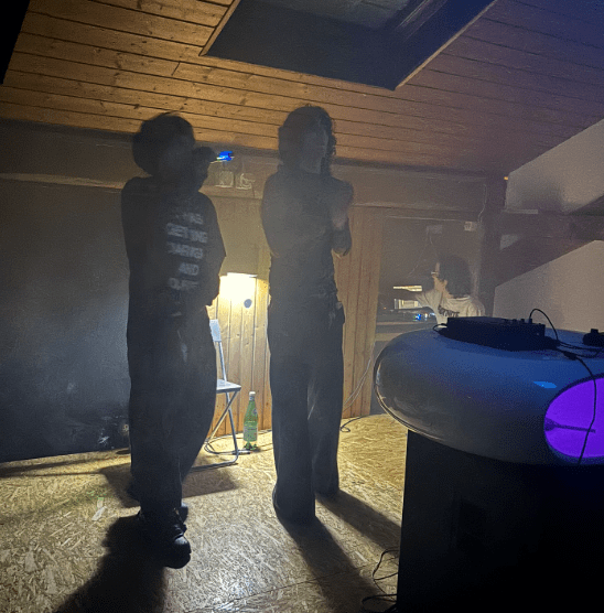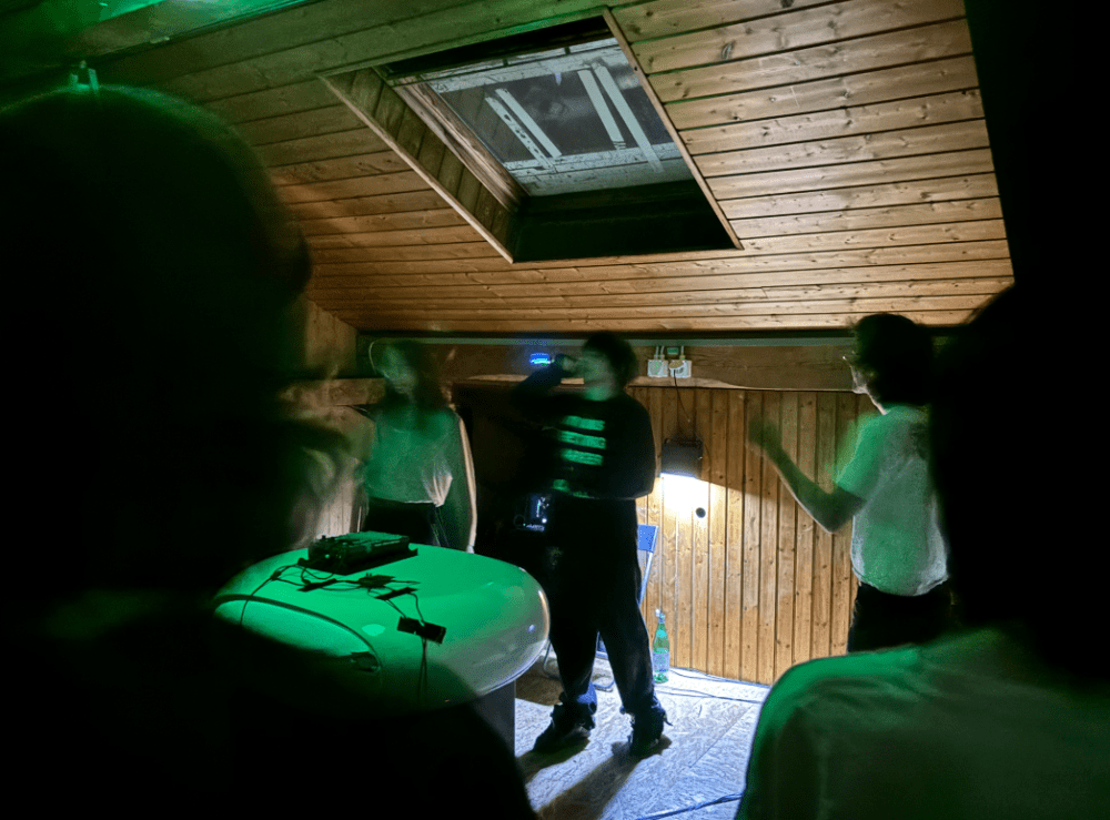 A dark coworking space humming with joy, excitement, and restless energy. I arrive early, wandering through the venue like an explorer before the crowd awakens. A smoking room. A game room. An arcade console on a flat screen, built, I’m told, by one of the music acts of the night LemanCapo. Controller in hand, I start chatting with one of the acts.