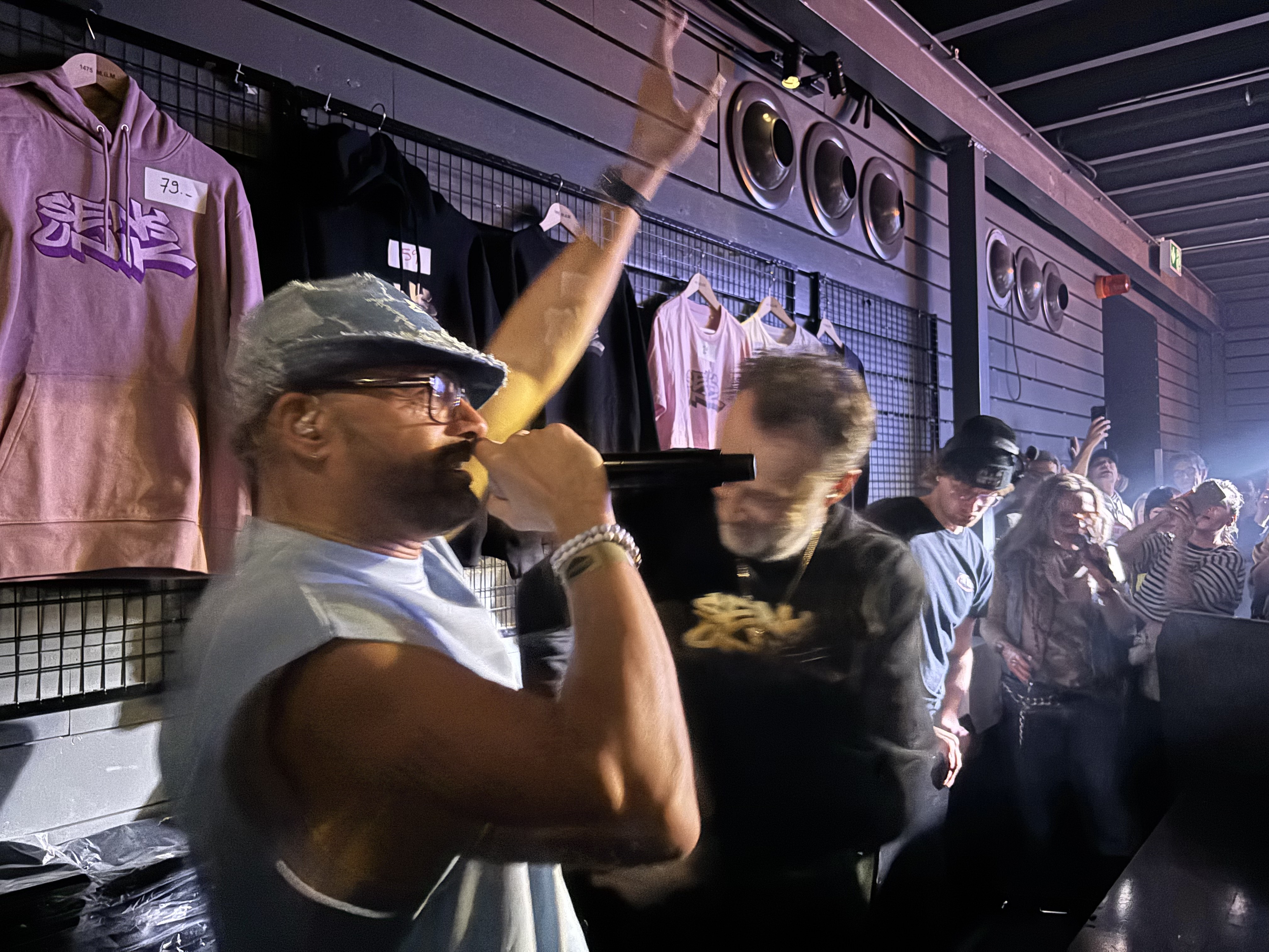 La première partie a fait un bon travail : un récit spoken word qui manque peut-être par moments d’un peu de relief, mais le rappeur OKS Rouge, expatrié français en Suisse — parti de Tours, passé par Paris et lié au collectif-label 12 Monkeys — appelle ses camarades Rappel Cham et Ron Brice en renfort et passe un cap dans la création d’une ambiance survoltée.